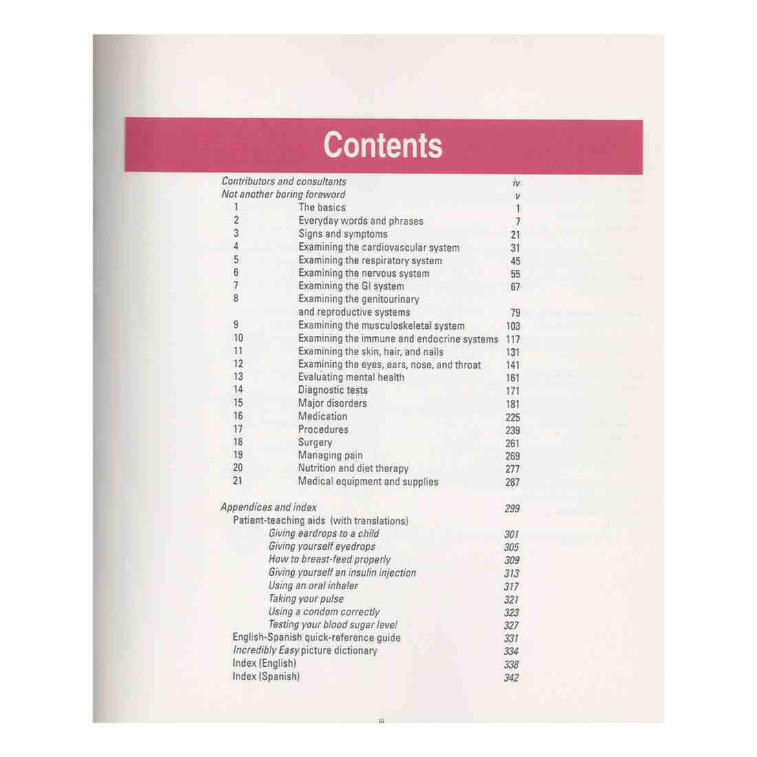Thoroughly updated for its Third Edition, this guide will help health care professionals in all clinical settings communicate easily with Spanish-speaking patients. It presents Spanish words, phrases, questions, and instructions that cover signs and symptoms, history-taking, assessment of all body systems, mental health, diagnostic tests, disorders, medications, procedures, surgery, nutrition and diet therapy, medical equipment, and alternative and complementary therapies. Features include a picture dictionary, clear body-system illustrations with labels in both languages, rules of Spanish pronunciation and grammar, and indexes in English and Spanish.