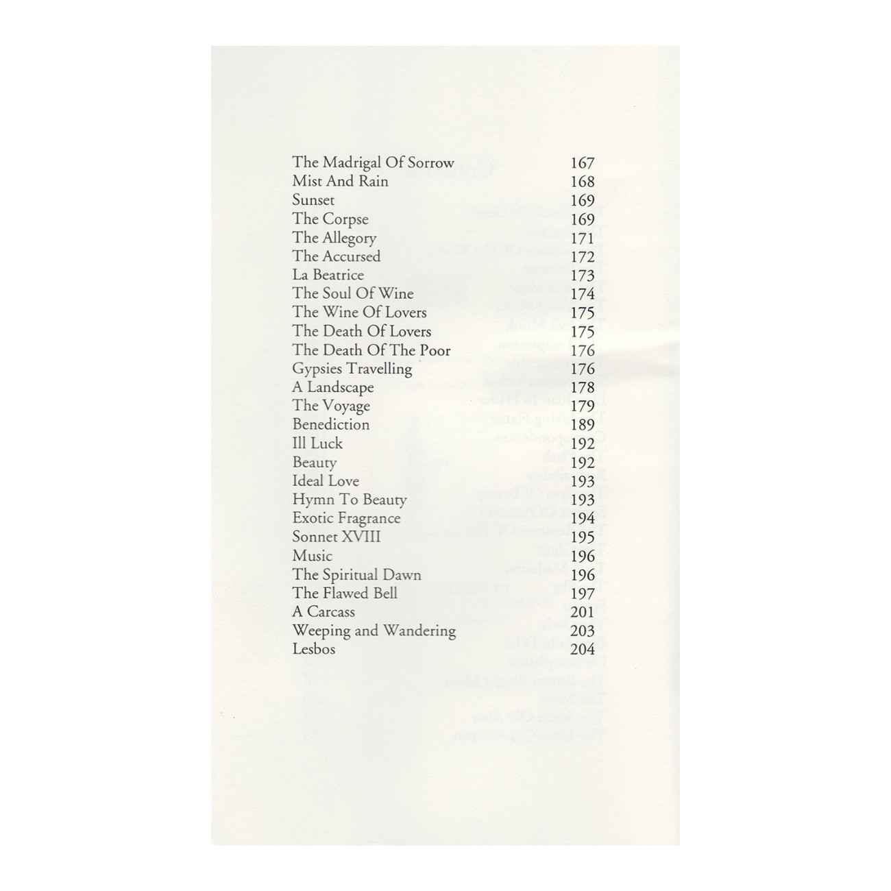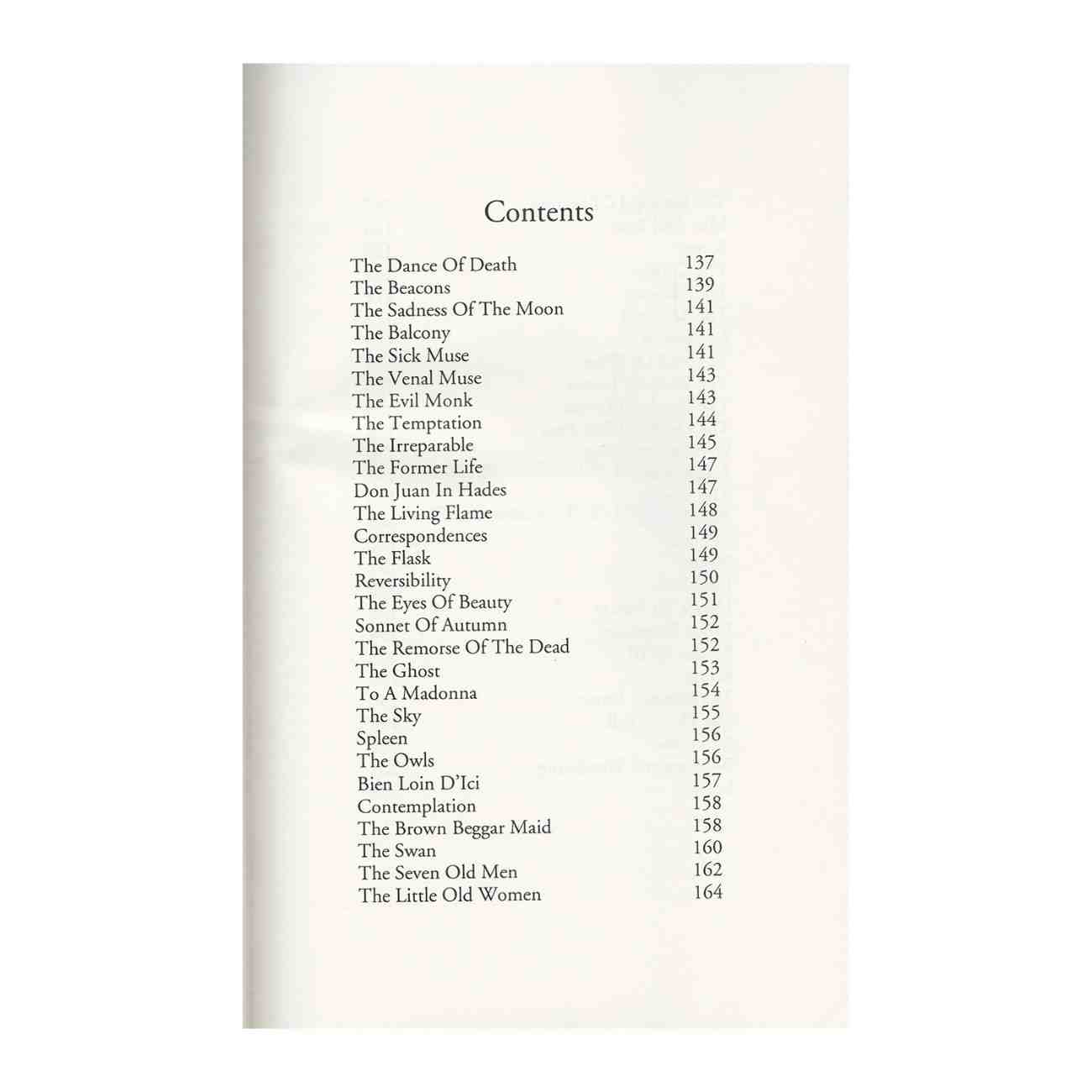 The Flowers of Evil is translated by F. P. Sturm and W. J. Robertson, to include Three Additional Poems (A Carcass – Weeping and Wandering – Lesbos). This Edition Contains: The Dance Of Death – The Beacons – The Sadness Of The Moon – The Balcony – The Sick Muse – The Venal Muse – The Evil Monk – The Temptation – The Irreparable – The Former Life – Don Juan In Hades – The Living Flame – Correspondences – The Flask – Reversibility – The Eyes Of Beauty – Sonnet Of Autumn – The Remorse Of The Dead – The Ghost – To A Madonna – The Sky – Spleen – The Owls – Bien Loin D’Ici – Contemplation – The Brown Beggar Maid – The Swan – The Seven Old Men – The Little Old Women – The Madrigal Of Sorrow – Mist And Rain – Sunset – The Corpse – The Allegory – The Accursed – La Beatrice – The Soul Of Wine – The Wine Of Lovers – The Death Of Lovers – The Death Of The Poor – Gypsies Travelling – A Landscape – The Voyage Benediction – Ill Luck – Beauty – Ideal Love – Hymn To Beauty – Exotic Fragrance – Sonnet XVIII – Music – The Spiritual Dawn – The Flawed Bell. Also included: A Carcass – Weeping and Wandering – Lesbos –